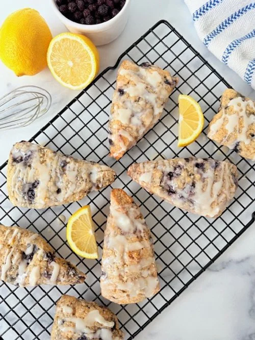 Once cooled, combine the ingredients to make the lemon glaze and drizzle over each scone. For easy clean up, place cooling rack over a large baking sheet lined with parchment paper and drizzle glaze over scones allowing glaze to drip onto the covered baking sheet. Scones can be kept at room temperature for 2-3 days, 5 days in the refrigerator, or 6 months in a freezer.